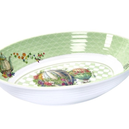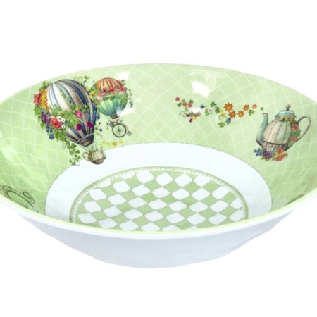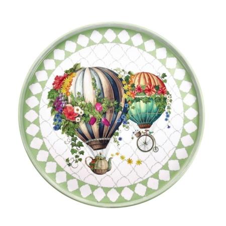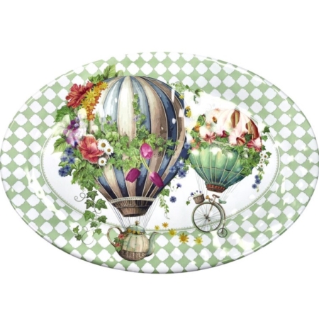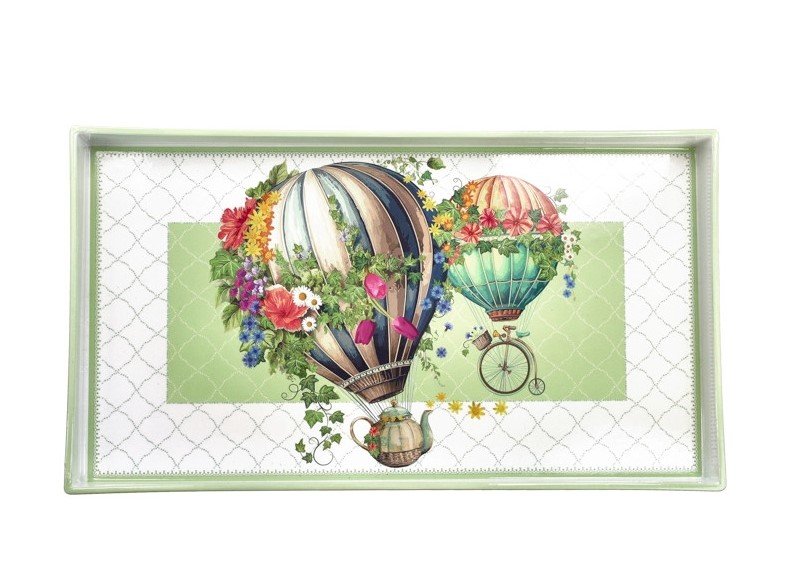 Il design è caratterizzato da un’illustrazione sognante: mongolfiere decorate con fiori vivaci che fluttuano leggere in un cielo senza tempo. Con le sue dimensioni di 34×19 cm, la forma a cabaret è ideale per servire con eleganza bibite, snack o per presentare la colazione a letto con stile.