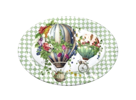 Il vassoio è interamente realizzato in melamina, un materiale tecnico celebre per la sua estrema leggerezza e resistenza agli urti, rendendolo praticamente infrangibile. Il design è un vero e proprio quadro: l’intera superficie è dominata da una fitta trama a scacchi verde e bianco che fa da sfondo a maestose mongolfiere ornate di fiori, biciclette vintage e teiere volanti.