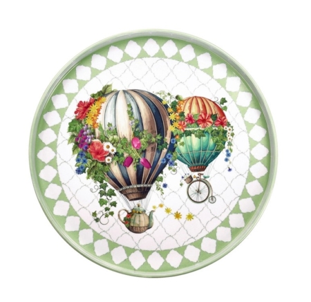 Il decoro centrale presenta oniriche mongolfiere adornate di fiori variopinti e dettagli fiabeschi, incorniciate da un elegante bordo geometrico verde pastello che richiama uno stile classico e raffinato. Con un diametro di 22 cm, è la dimensione perfetta per servire il caffè, piccoli pasticcini o per essere utilizzato come elemento decorativo svuota-tasche.