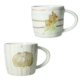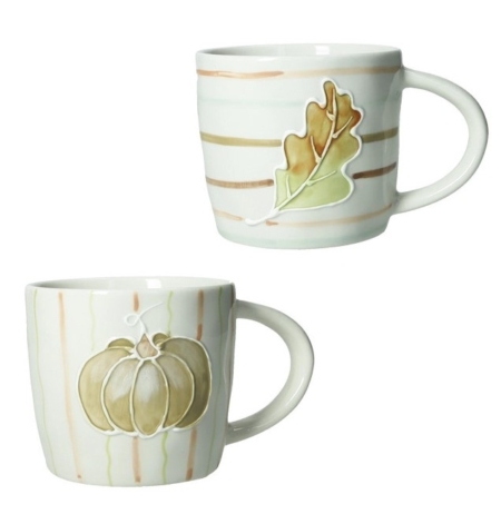 Realizzati in resistente stoneware, questi mug sono ideali per l’uso quotidiano. Il set comprende due mug con decorazioni complementari: una mug presenta un elegante motivo a righe verticali e una delicata foglia di vite stilizzata in rilievo, che evoca i colori e la freschezza dei boschi autunnali. L’altra mug è decorata con una stampa a quadri e una dolce zucca, aggiungendo un tocco di rustica eleganza e fantasia.