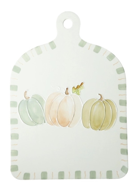Realizzato in stoneware di alta qualità, questo tagliere è resistente e durevole, perfetto per tagliare frutta, verdura e altri ingredienti. Il design presenta tre delicate zucche in rilievo, dipinte con tonalità calde e accoglienti, circondate da una bordatura a quadretti verdi e bianchi che richiama le texture tipiche dell’autunno. L’elegante forma a cuore stilizzato e il foro sul manico per appenderlo lo rendono un accessorio funzionale e di facile conservazione.