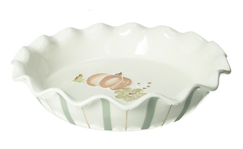 Tortiera in stoneware (diametro 25 cm) con decorazioni a zucche e bordatura a coste. Ideale per preparare e servire torte e quiche, aggiunge un tocco autunnale alla tua cucina.